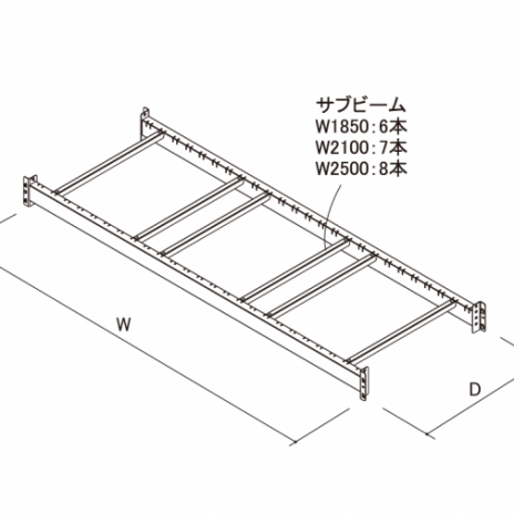 ビーム(B2)・小梁(サブビーム)付です。 サブビーム(W1850:6本、W2100:7本、W2500:8本) 製品は全て塗装仕上げです。(溶融亜鉛メッキの場合は別途ご指定ください。)