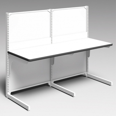 単独用 配線用穴アケ加工対応いたします。 天板部:ホワイトメラミン化粧板 小口部:ライトグレー見付板 増連用 配線用穴アケ加工対応いたします。 天板部:ホワイトメラミン化粧板 小口部:ライトグレー見付板 連結の場合、単独用天板は使用せず、 総全長に合わせた増連用天板に差替えます。カウンターのレイアウトをご指示ください。
