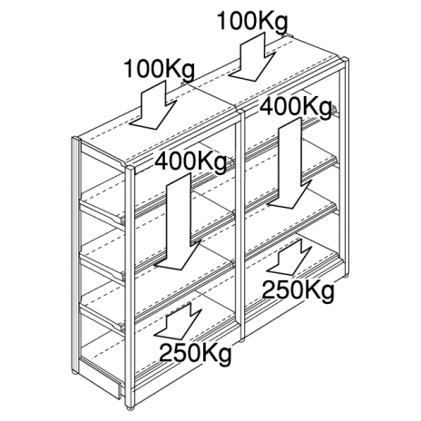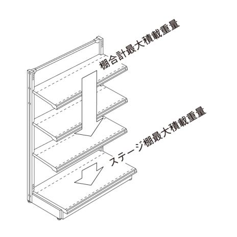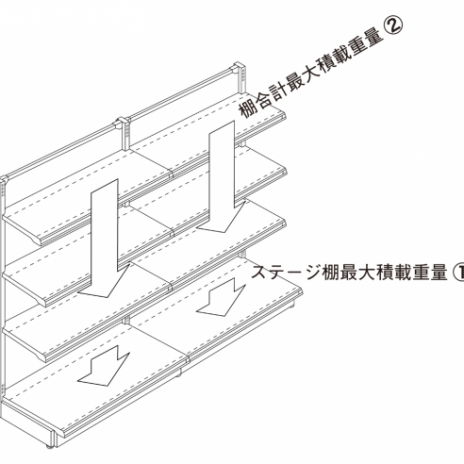 警告 積載重量をお守りください。倒壊の原因となります。 (商品を均等に乗せた時の重量です) 単独型 棚合計最大積載重量(kg) ステージ棚合計最大積載重量(kg) 連結型 棚合計最大積載重量(kg) ステージ棚合計最大積載重量(kg) 重要 什器高さが1800を超える場合、最大積載重量が上表より大きくなる場合はお客様の責任にて各種固定金具で倒壊防止施工を行...